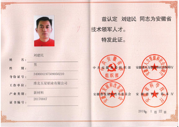 2018年1月22日,我司總經(jīng)理劉建民被認(rèn)定為安徽省技術(shù)領(lǐng)軍人才。